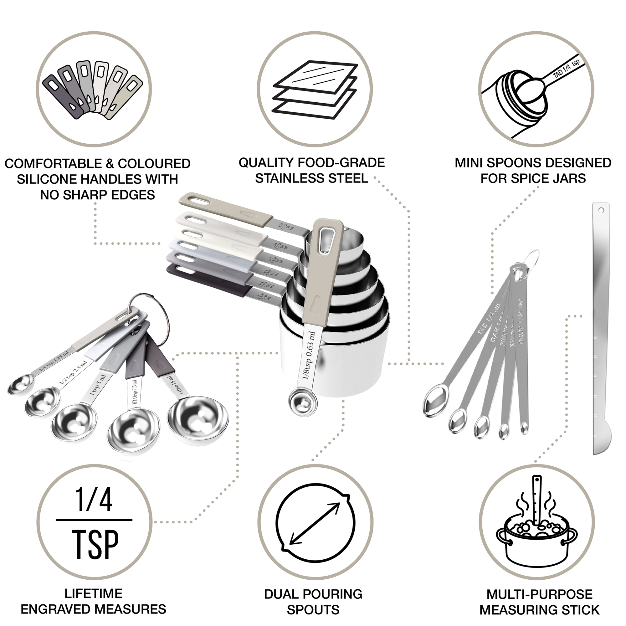 About the Product: The Measuring Cups & Spoons are perfect for wet and dry ingredients. With 22 pieces, this product is ideal for both experienced cooks and learners, making the measuring of ingredients for your favorite recipes easy and precise.