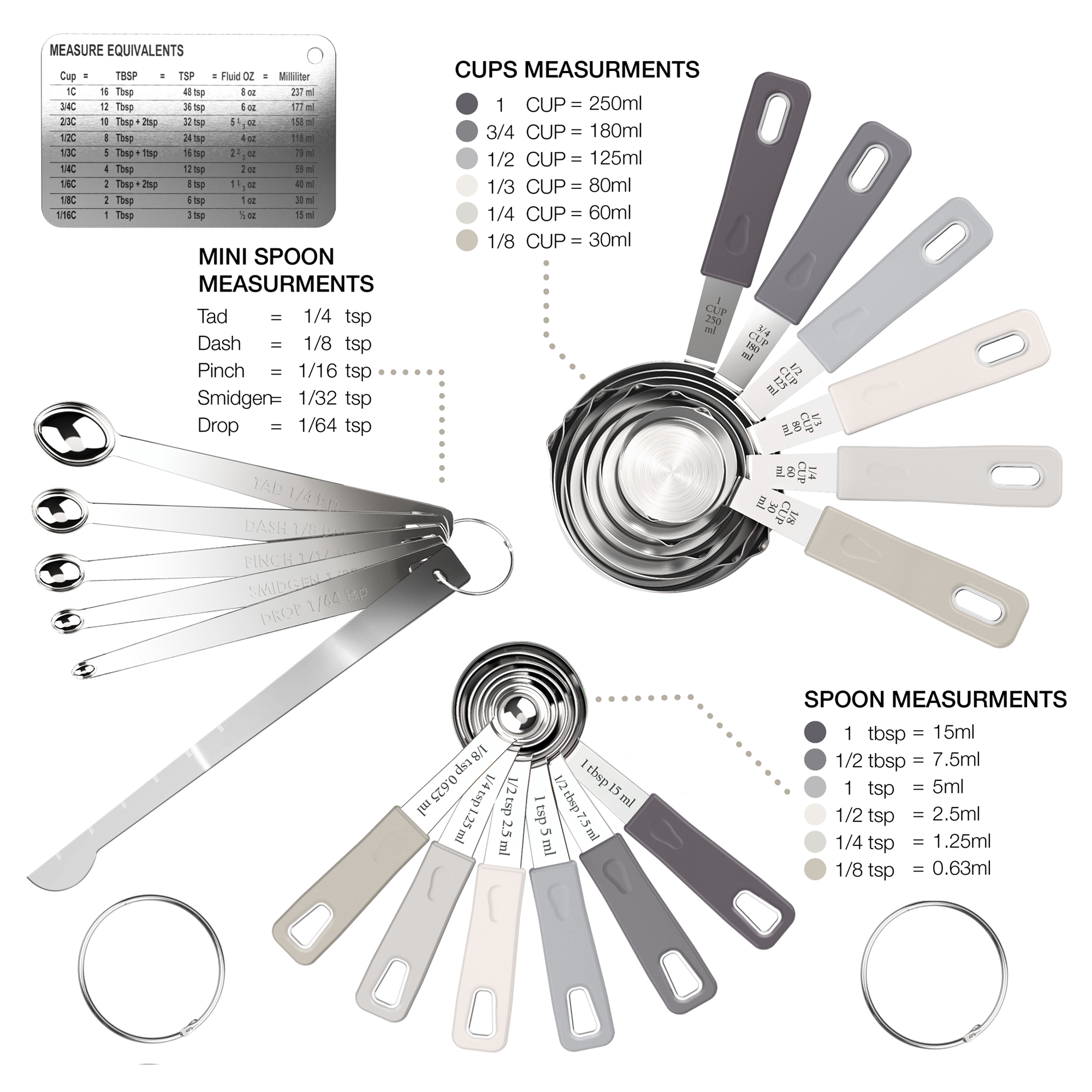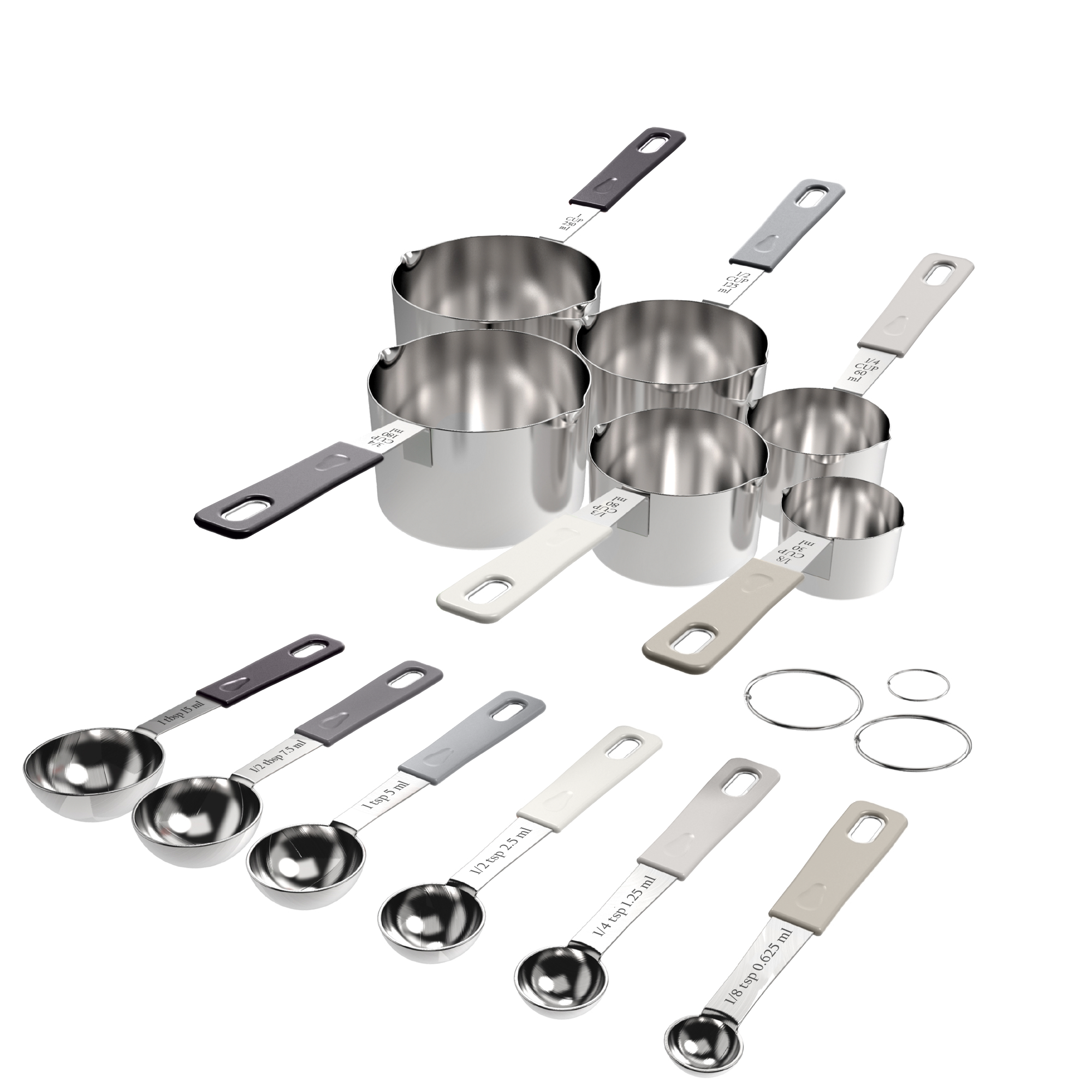 Storing: Included are three round hinged rings for threading through the handles. The cups and spoons are stack-able and nestle into each other! Either hang them up within easy reach or store them in your favorite drawer.