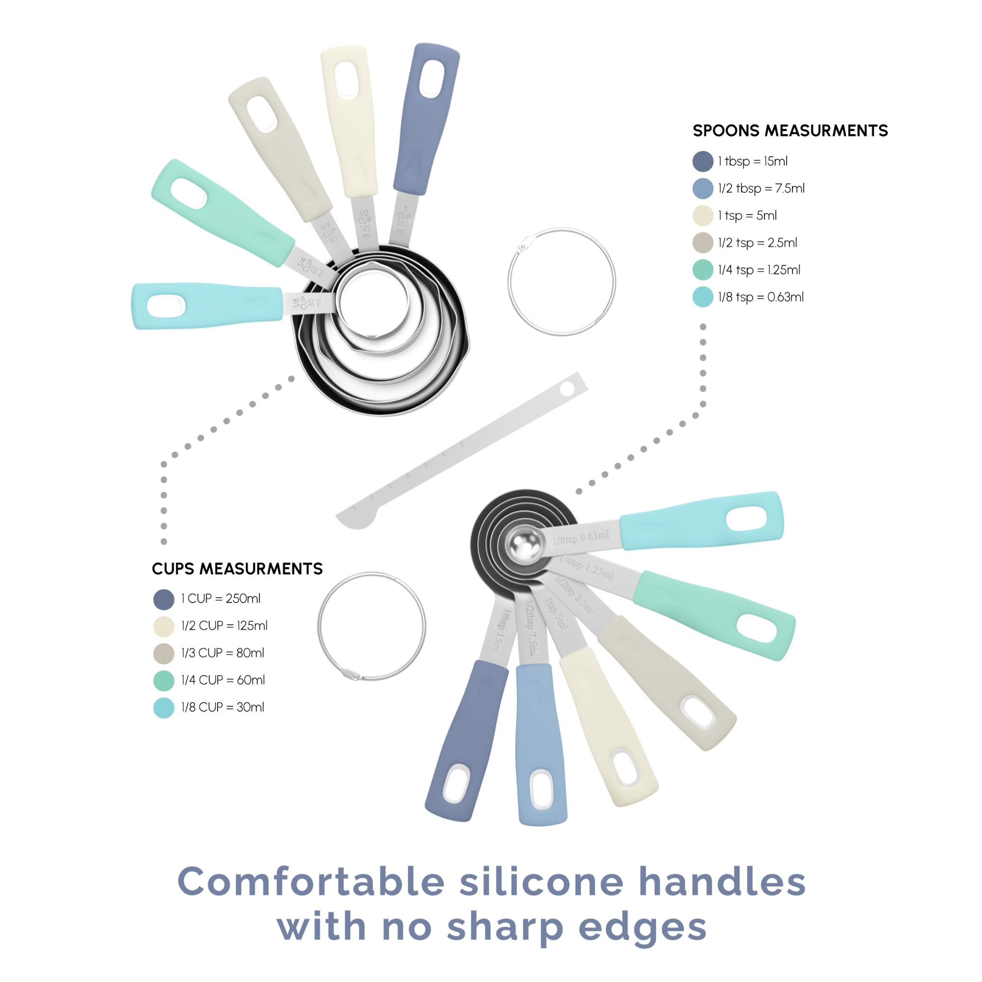 - This versitile set of 14 pieces include: * 5 measuring cup set (1/8, 1/4, 1/3, 1/2 and 1 cup ) * 2 tablespoon measure spoon (1 and 1/2 tbsp) 4 teaspoon measuring spoons (1, 1/2, 1/4 and 1/8) * 1 leveling tool with mini-ruler * 2 round hinged rings.
